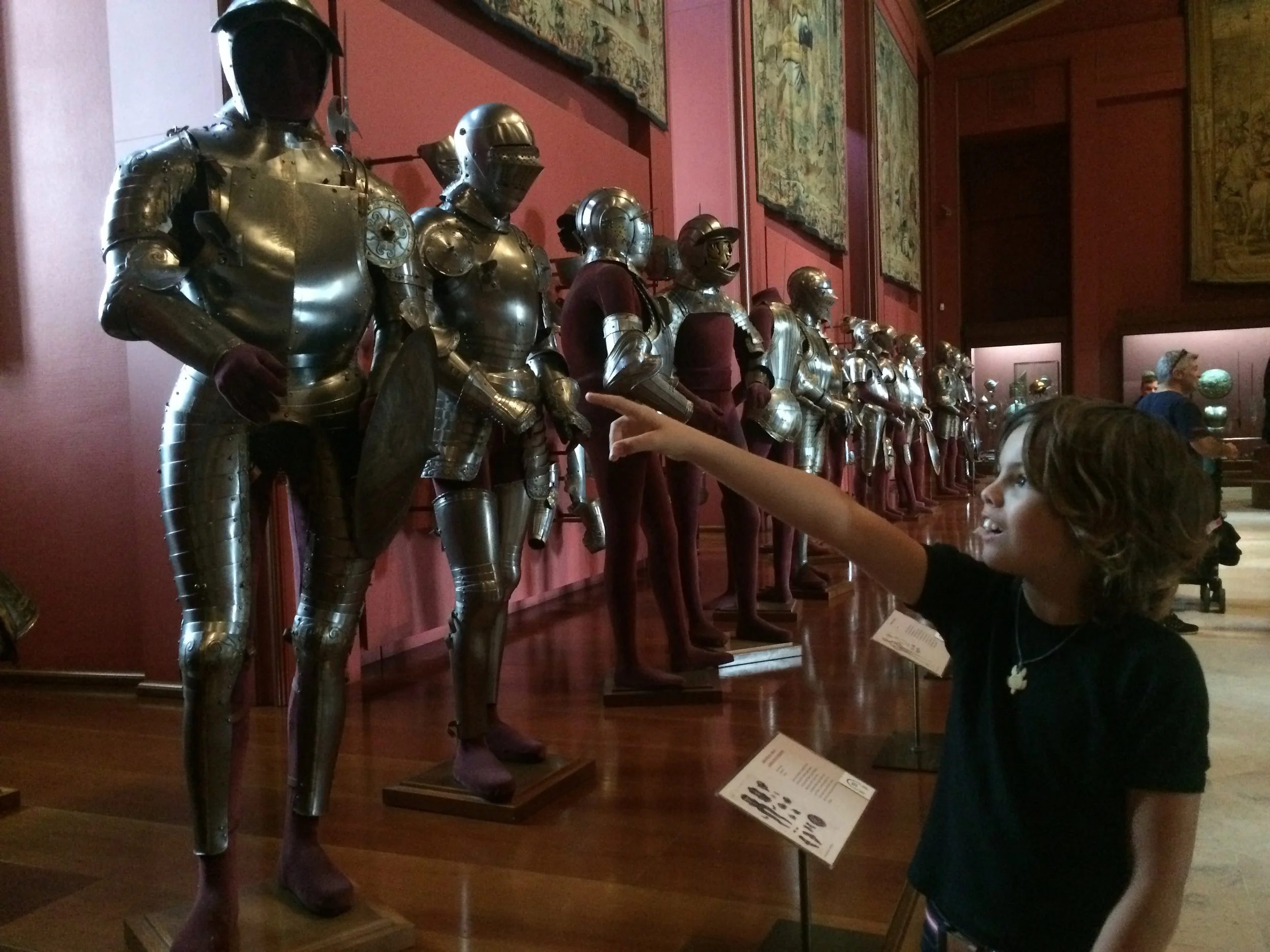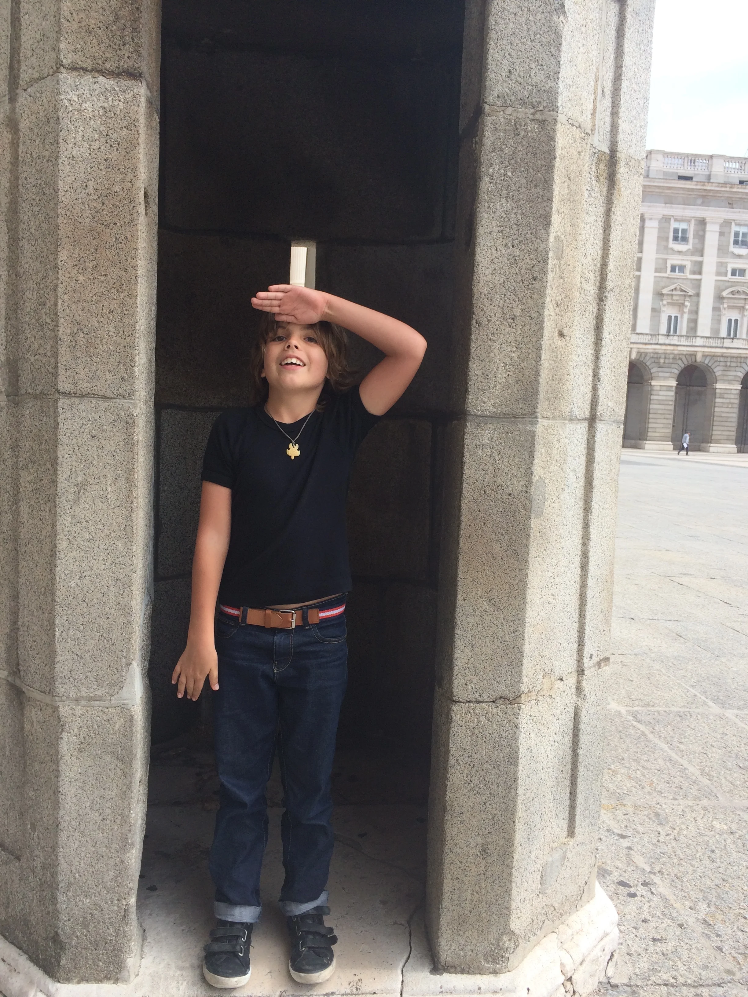 We are at the armoury museum at the Royal Palace. We were in the middle of the plaza and I was trying out my Karate moves. This is on my Birthday. My birthday was fun because I got 50 euro. Now I have 70 euro. We were going to go to a big park, but I wasn't tall enough to go on the rides.