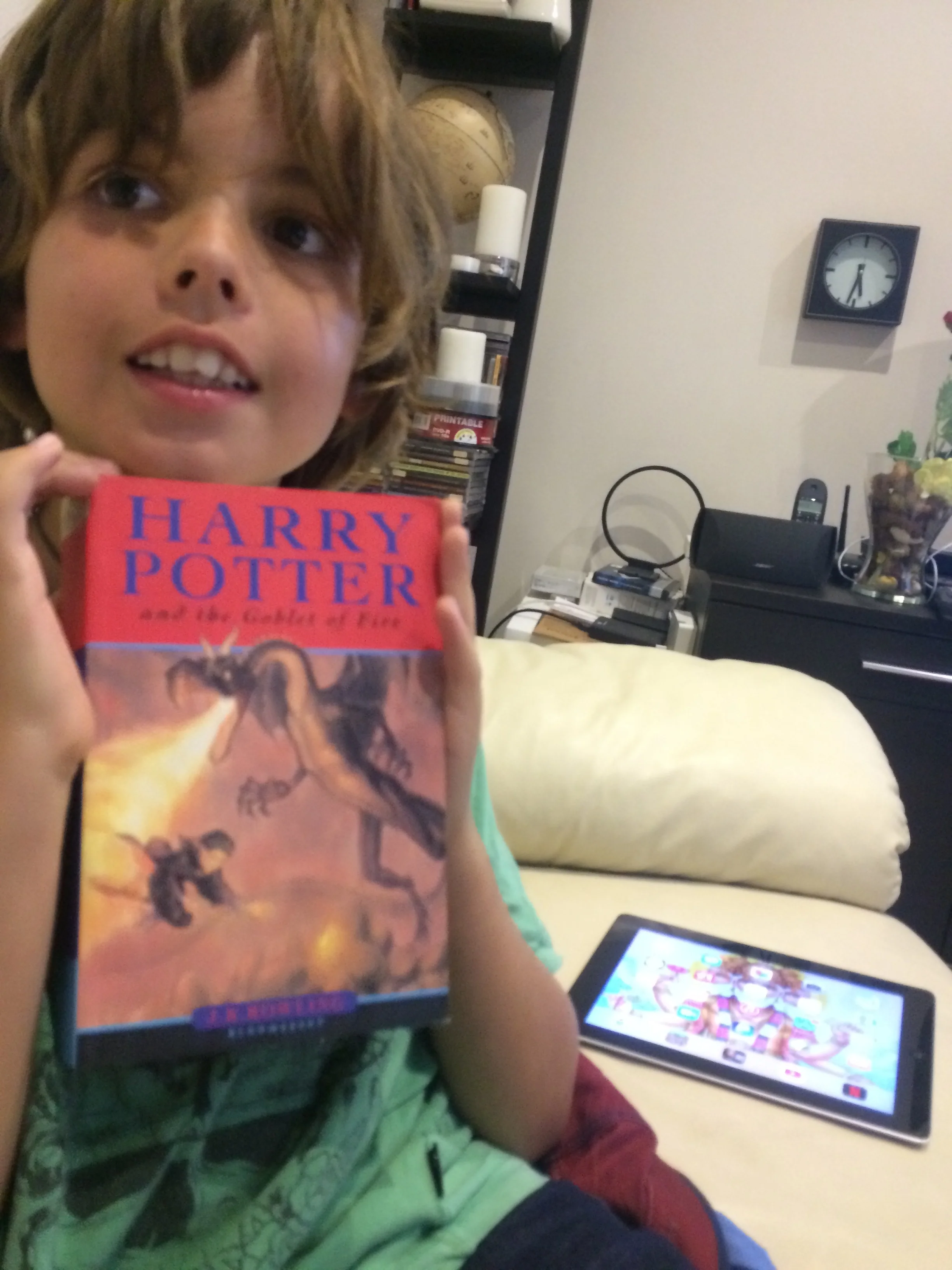 this is the book called HARRY POTTER AND THE GOBLETS OF FIRE and its really hard to read it. I reckon the cover looks epic with a dragon and Harry Potter.