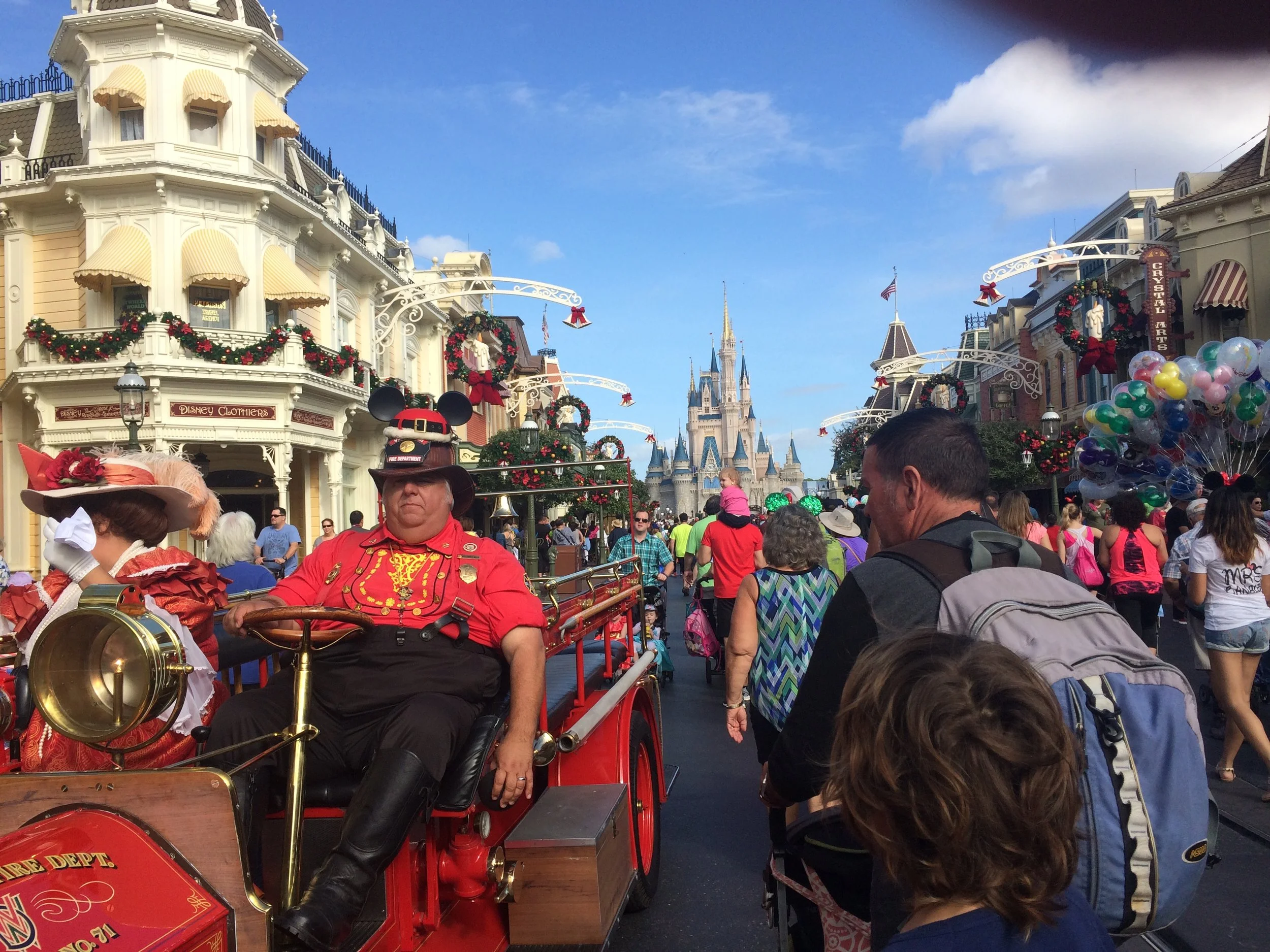 This is main street at the magical kingdom. You can buy lots of stuff and there are lots of parades, marching bands and singing. It gets very crowded.