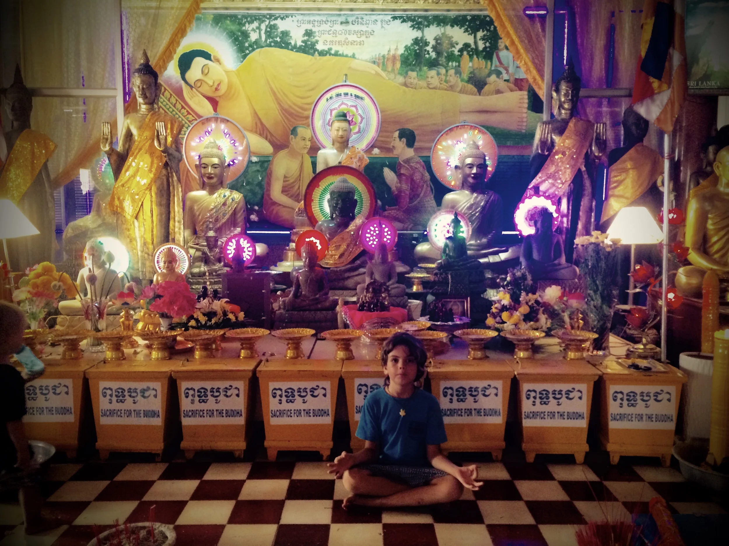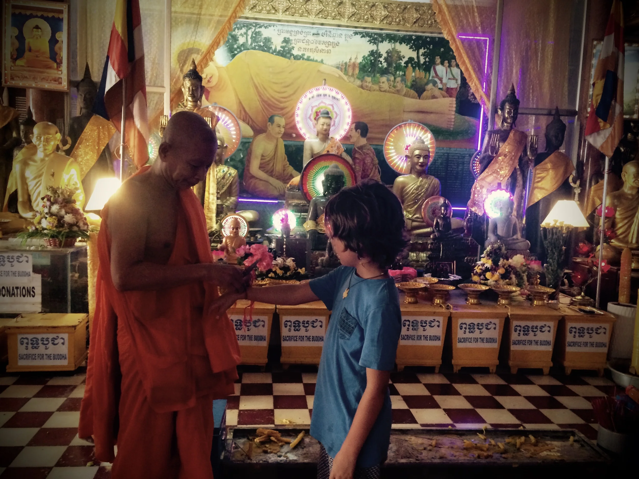 Nick the tuk tuk driver drove us to see a temple. it was a Buddhist temple and lots of statues of Buddha and monks in Orange robes. Buddhism is all about peace, and quiet and calmness. I really like it because there is no violence. They are always nice. They have really cool statues and really good offerings to buddha. They offer flowers and incense. The monk put a red string on my wrist. I like it a lot. I think it looks cools so I am not taking it off until it falls off, or breaks.