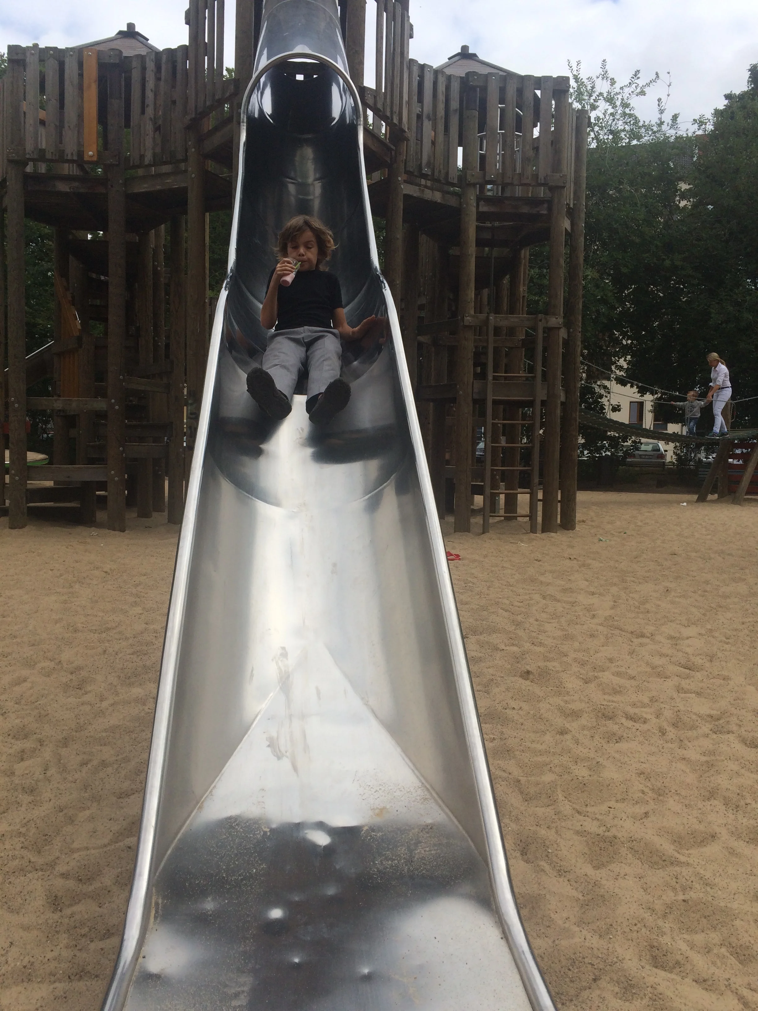 There a lot of parks in berlin. There are lot of parks in Berlin because everyone lives in apartments. The children don't want to stay inside so everyone comes to the parks to play. The parks are better here than Australia because they have bigger slides. The slide is really fun. It felt really weird going down the slide because there was a big bump in the middle. i found four friends to play with. They spoke english.