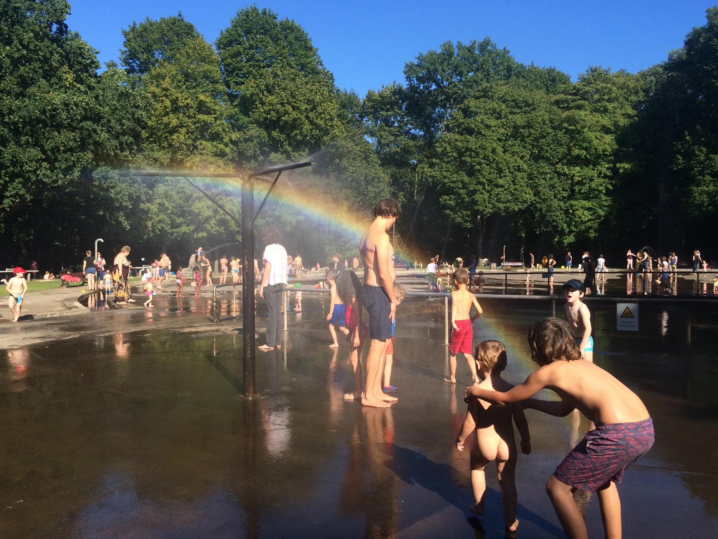 This is a water park in berlin. It sprays water to cool all the kids off - but the water was so cold! it was freezing. I couldn't go in - but then I got used to it. I saw lots of rainbows because of the sun and the water.