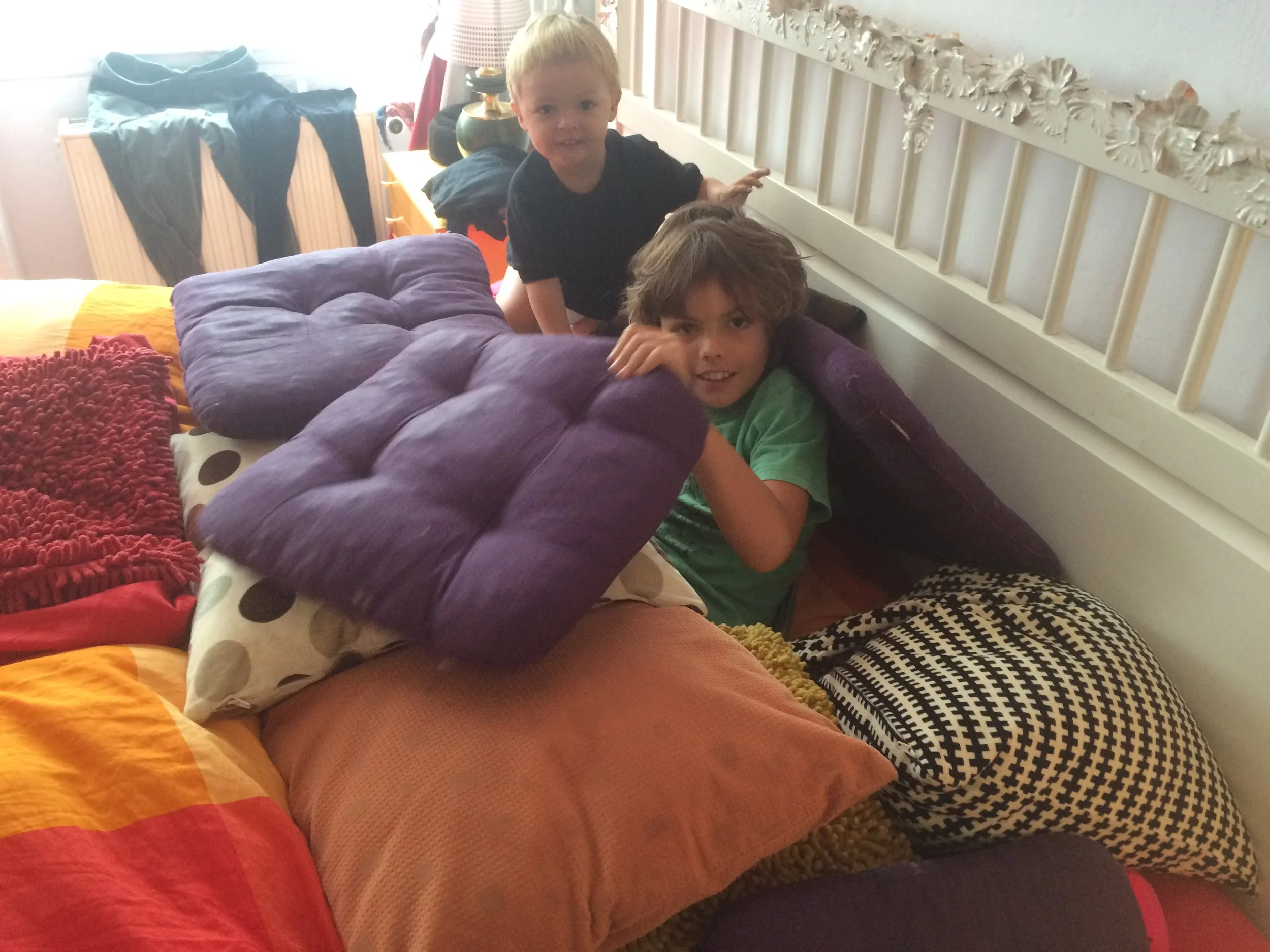 This is mum and dad's bedroom. I had this idea to make a pillow fortress. Hugo keeps wrecking it. I wanted him to go to bed so I could relax in it. It was really fun. I used every pillow in the house.