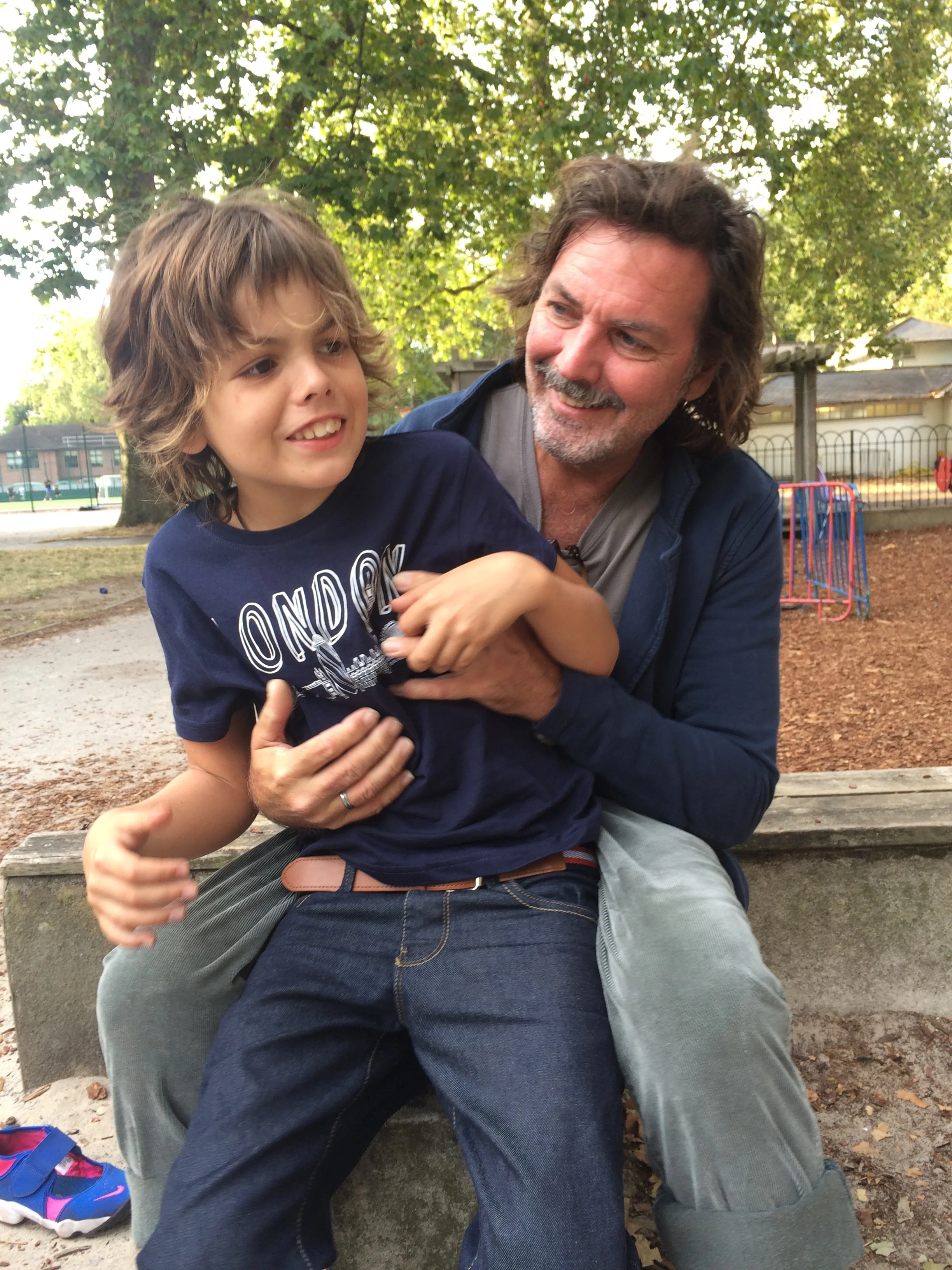 This is me at the park. Dad is tickling me. I fell on the dirt. I play on the zip line a lot. Hugo went on with me. I went on by myself and I went too fast.