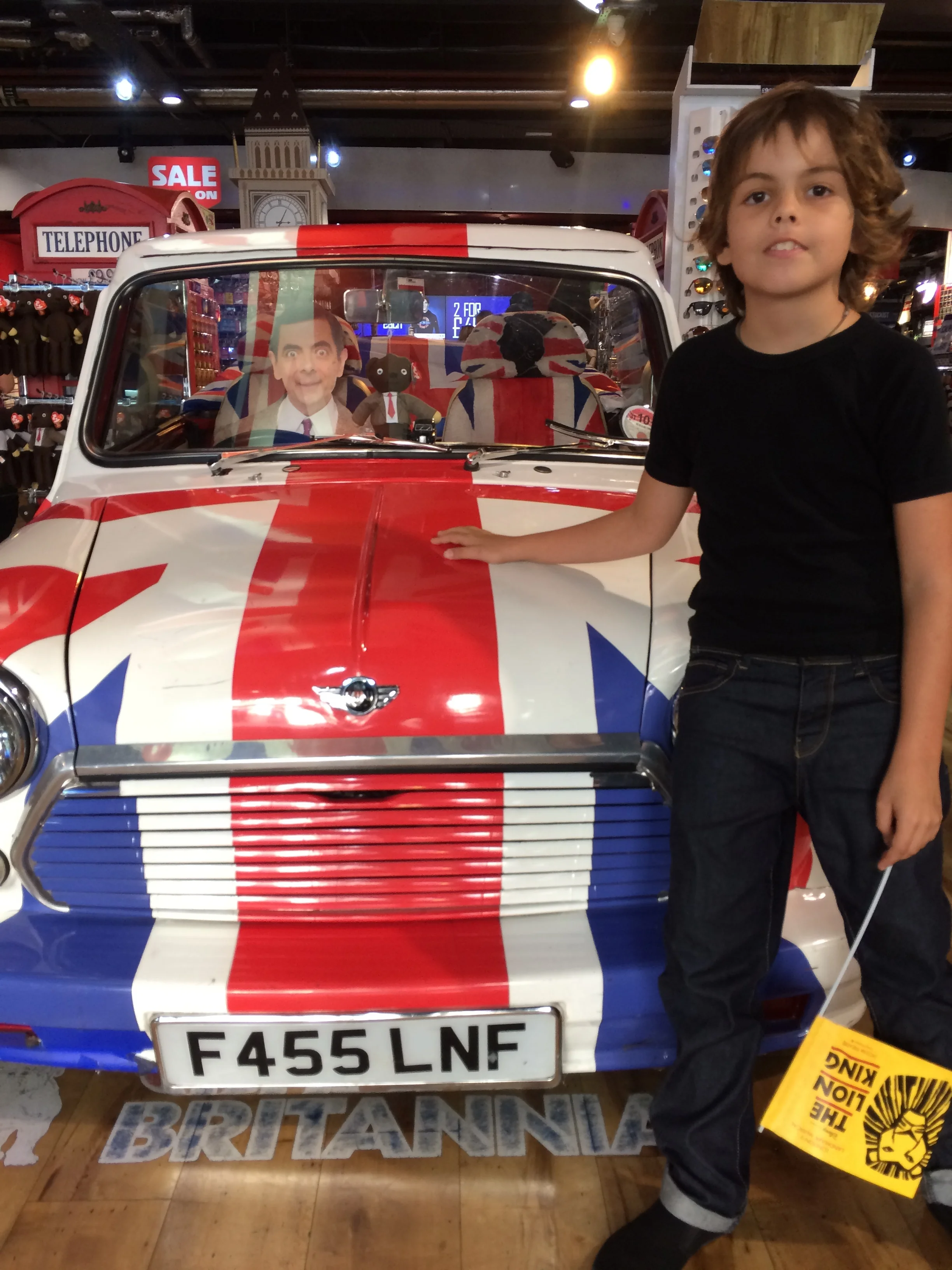 this was in a shop and mr bean was in the car. It was really cool because it had the british flag on it. In this shop there was heaps of english flags.