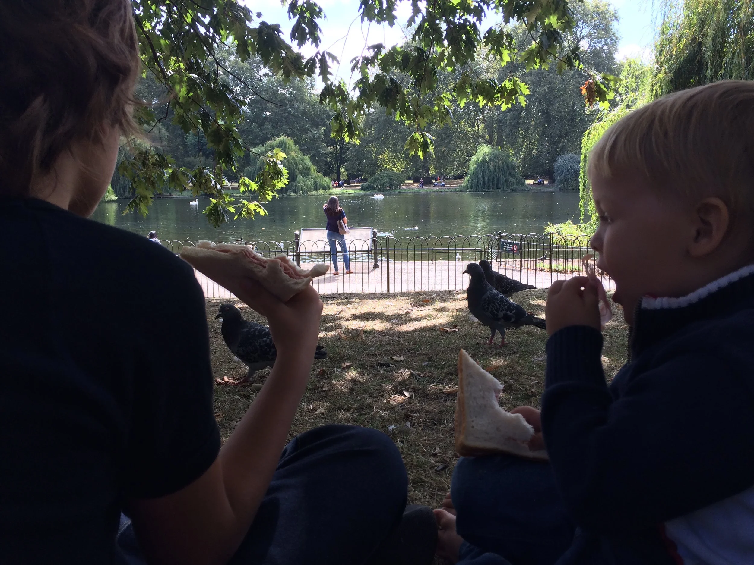 We had lunch in the park. I fed the duckies and pigeons. We had a lot of bread to feed them. I thought I had a big pet duck, so i tried to feed it a lot so it would follow me, but it didn't work out in the end.