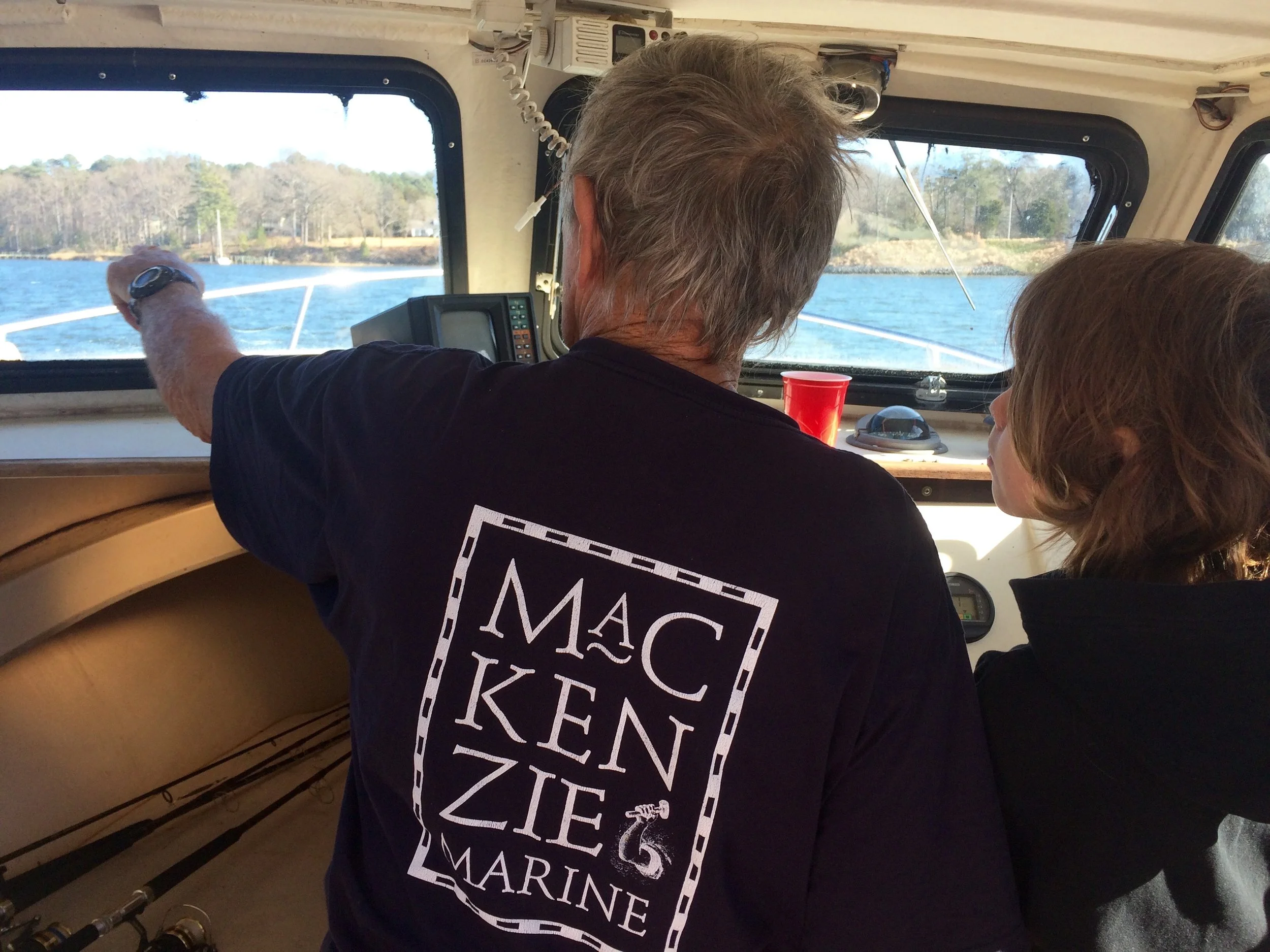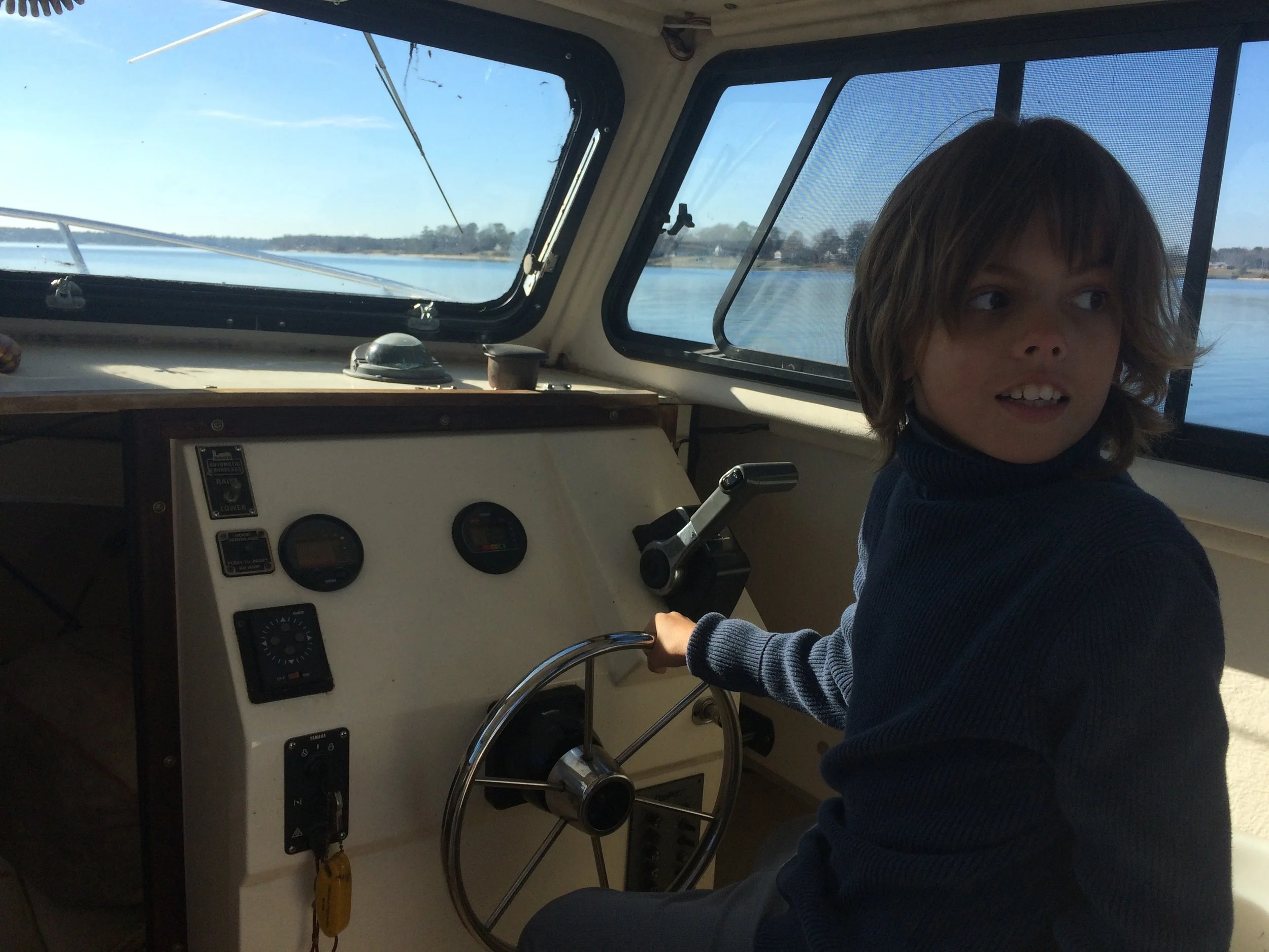 This is me steering. We went all through the little bays and coves. We saw lots of boats and wharfs and houses.