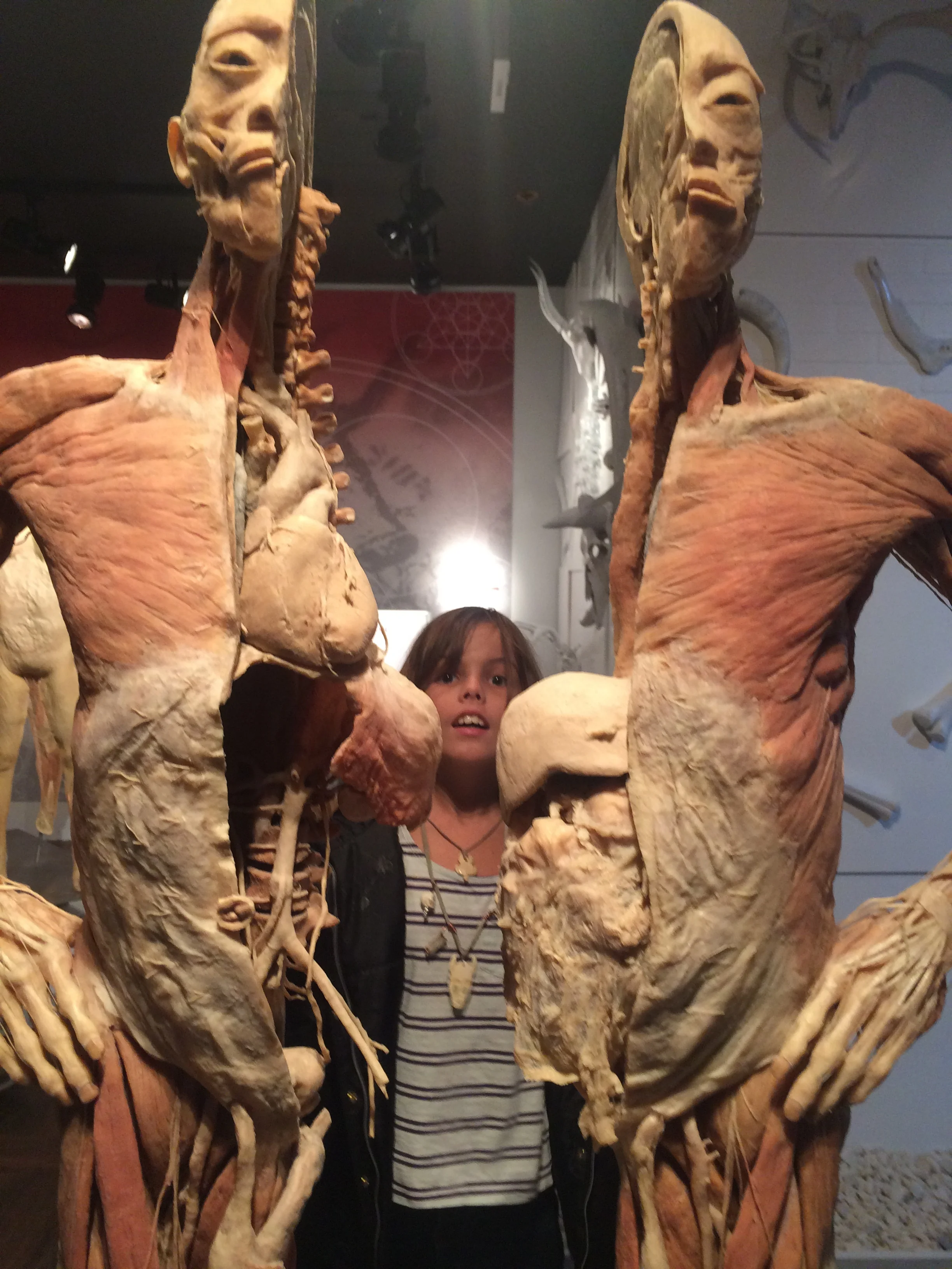 This is the body chopped in half and you could see everything that is going on inside a body. I saw the heart, the lungs, the stomach, veins, liver, small intestines and large intestine. We entered another room - it was a death room- and we had to enter a dark hallway. I was really scared and a little shocked. At the end of the hallway was a lot of bones, and displays of different death rituals that happen in different countries. It was a fantastic exhibition. Mum really wanted to go as she wrote about it in a thesis years ago.